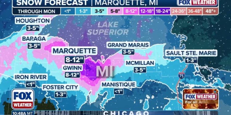 Northwest Indiana could see up to two feet of snow, while parts of Michigan and upstate New York are likely to see 8–12 inches with locally higher amounts possible.