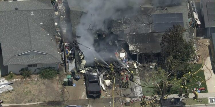 Footage shared with KTLA showed firefighters on scene as the home in the 1600 block of Edmund Street appeared to be fully engulfed in flames.