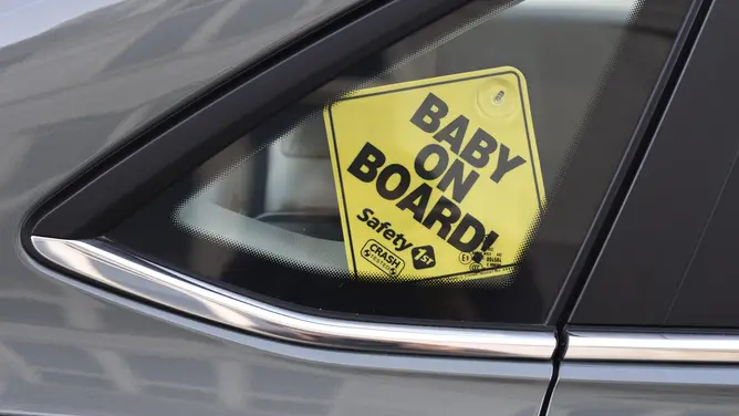 NASHVILLE, TENNESSEE – SEPTEMBER 2, 2019: A ‘Baby On Board!’ sign hangs in the back window of a car in Nashville, Tennessee.
