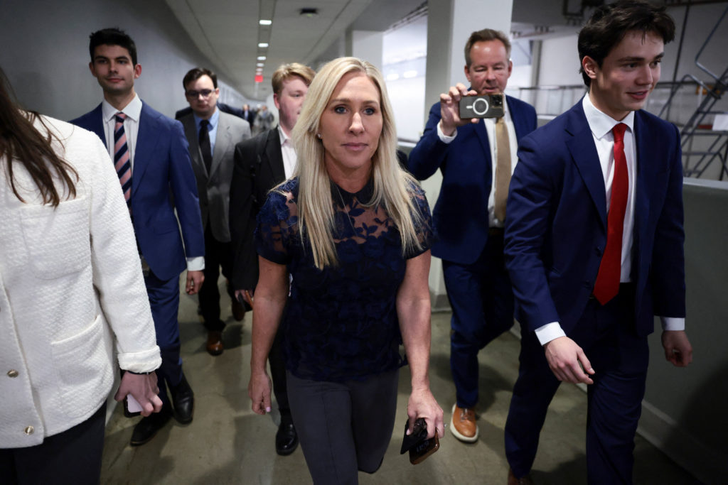 U.S. Representative Marjorie Taylor Greene (R-GA) walks to her final vote, surrounded by staff, in Washington