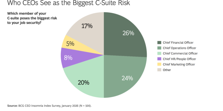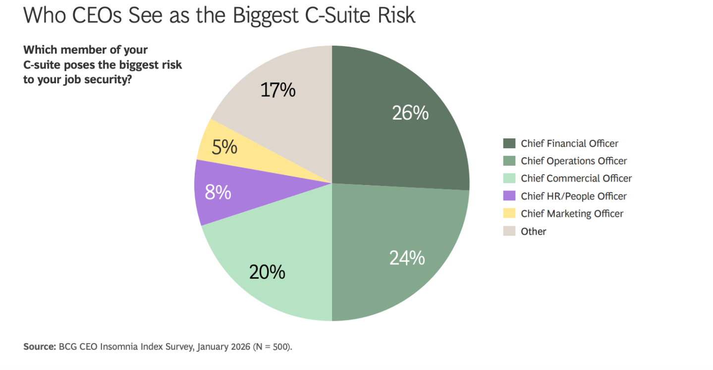 More than a quarter of CEOs surveyed said their chief financial officer poses the greatest threat to their job security, ahead of every other C-suite role, followed by the COO. But the risk isn’t necessarily all about competition; it’s also about misalignment.