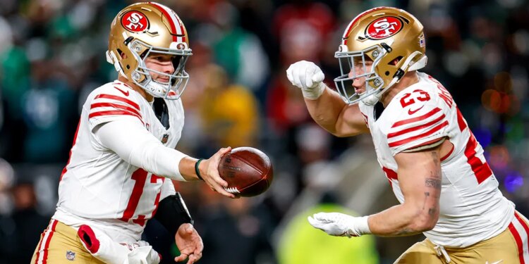 Brock Purdy of the San Francisco 49ers hands the ball off to Christian McCaffrey #23 during the third quarter of the NFC Wild Card playoff game against the Philadelphia Eagles at Lincoln Financial Field on Jan. 11, 2026 in Philadelphia, Pennsylvania. (Lauren Leigh Bacho/Getty Images)