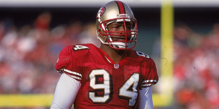 Charles Haley of the San Francisco 49ers looks on from the field during the game against the Atlanta Falcons at 3 Comm Park in San Francisco. (Tom Hauck/Allsport)