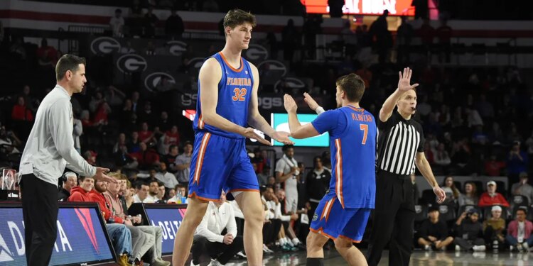 Center Olivier Rioux of the Florida Gators checks into the game for guard Urban Klavzar of the Florida Gators during the college basketball game between the Florida Gators and the Georgia Bulldogs on Feb. 11, 2026, at Stegeman Coliseum in Athens, Georgia. (Jeffrey Vest/Icon Sportswire via Getty Images)