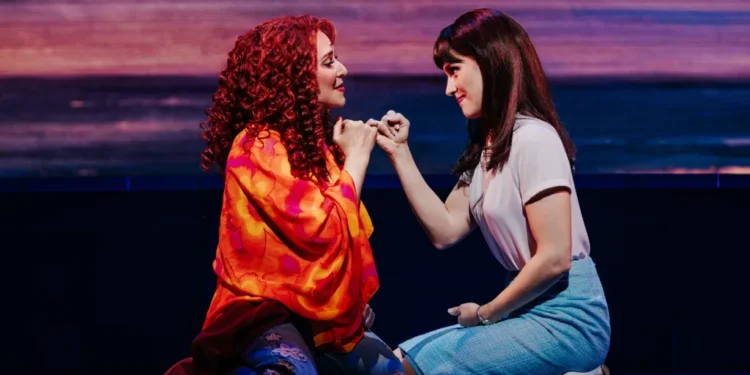 We first meet CeeCee and Bertie (named Hillary in the movie that starred Midler and Barbara Hershey) on an Atlantic City beach when the girls are children, or, more accurately here, tiny adults with all the characteristics they’d take through life. CeeCee (a scene stealing, for better and sometimes worse, Samantha Schwartz, directed to channel both Midler and Mae West) is already something of a boardwalk star, performing in a bright red bustier-style get-up and fishnet stockings, sassing her equally brassy mom (whom she calls by first name Leona) and encouraging milquetoast Bertie to ignore her own stuffy mom’s instructions by dipping a toe or two in the surf. Challenge accepted, friendship born.