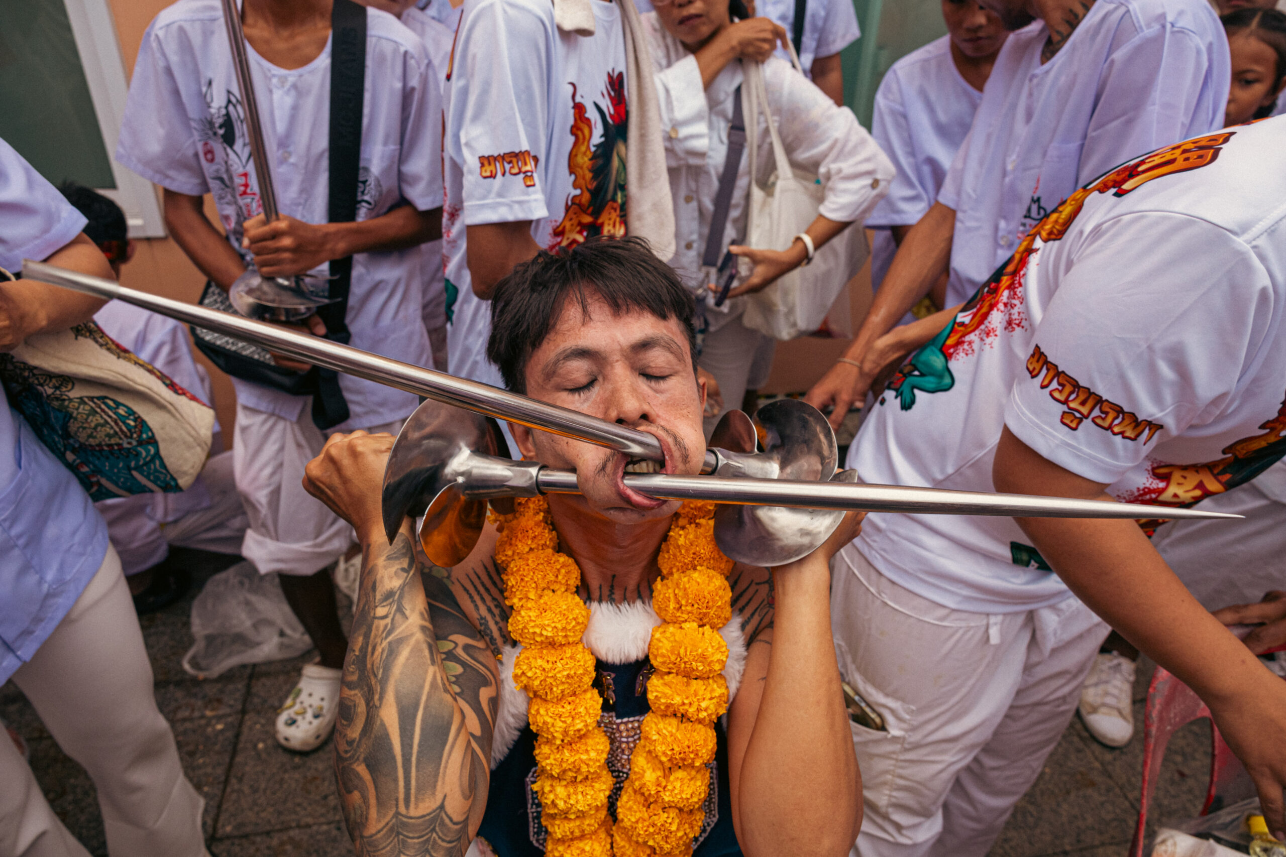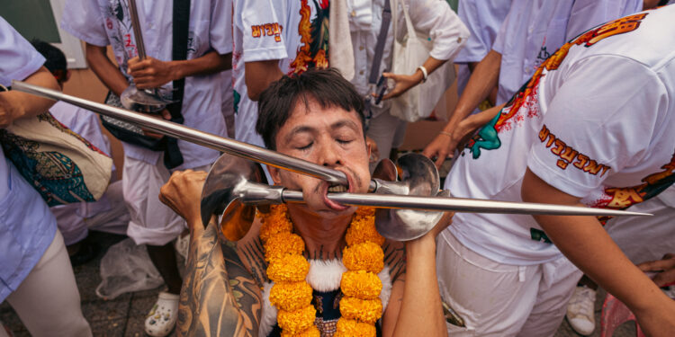 In Phuket’s Old Town, hundreds of followers marched through the streets with blades jammed through their cheeks and blood dripping from their mouths.