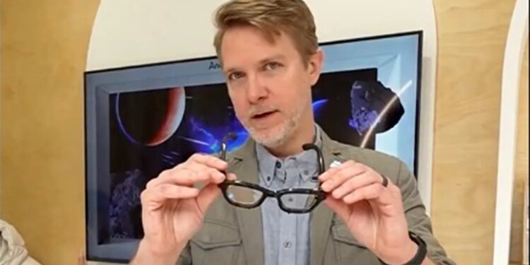 Google product lead Dieter Bohn demonstrates prototype AI smart glasses during a demo showing how the device can capture and modify photos using generative AI. (X/ @backlon)