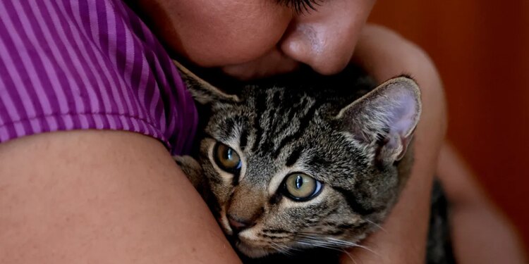 A pet owner is seen cradling a cat on their lap. (Diego Herrera Carcedo/Anadolu via Getty Images)