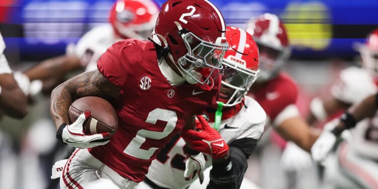 Alabama Crimson Tide wide receiver Ryan Williams (2) runs after making a catch during the second quarter against the Georgia Bulldogs during the 2025 SEC Championship game at Mercedes-Benz Stadium on Dec. 6, 2025. (Brett Davis/Imagn Images)