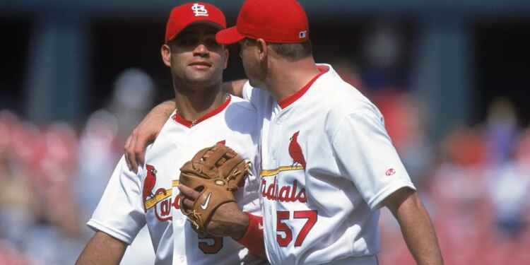 Albert Pujols and Darryl Kile of the St. Louis Cardinals walk on the field during a game against the Pittsburgh Pirates at Busch Stadium in St. Louis, Missouri, on May 10, 2001. (Elsa/Getty Images)