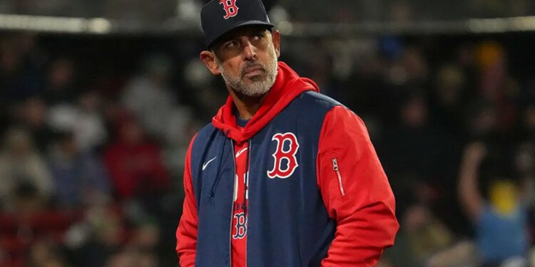 Boston Red Sox manager Alex Cora returns to the dugout during the sixth inning against the Milwaukee Brewers at Fenway Park in Boston April 7, 2026. (Barry Chin/The Boston Globe/Getty Images)