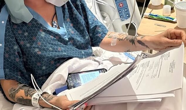 She also uploaded a snap of her working from the bed, while still hooked up to an IV drip.