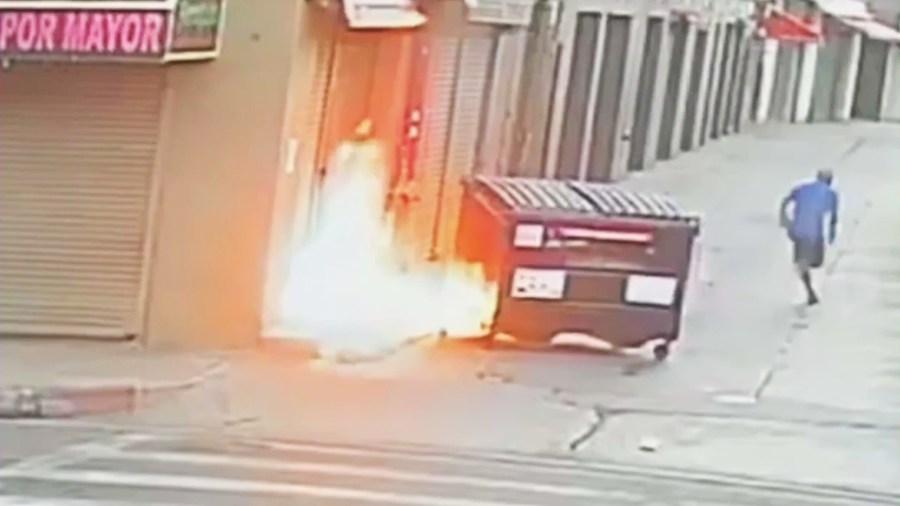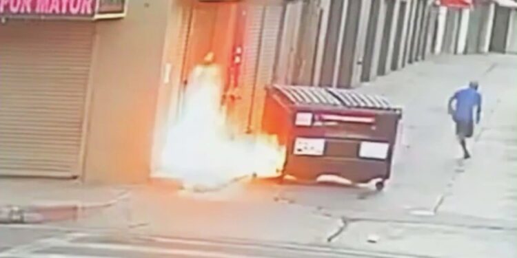 The masked suspect attempts to hide behind the dumpster as he pours flammable liquid all over the ground at the shop’s entrance before lighting the spot on fire. He then sprints away from the growing blaze.