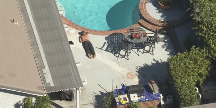Sky5 footage showed the shirtless suspect lying face down, possibly asleep, next to a pool in the backyard, with two firearms atop a table next to him.