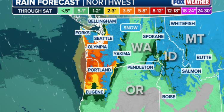 MONROE, Wash. — A powerful atmospheric river is intensifying across the Northwest and is expected to bring more heavy rain and potentially flash flooding, as well as feet of mountain snow to Washington, Oregon, Idaho and Montana.