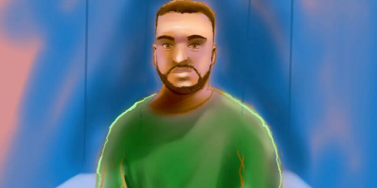 A court sketch depicts accused Bondi shooter Naveed Akram appearing via video link from Goulburn Supermax prison at Downing Centre Local Court in Sydney, Monday, Feb. 16, 2026. (Rocco Fazzari/AAP Image via AP)