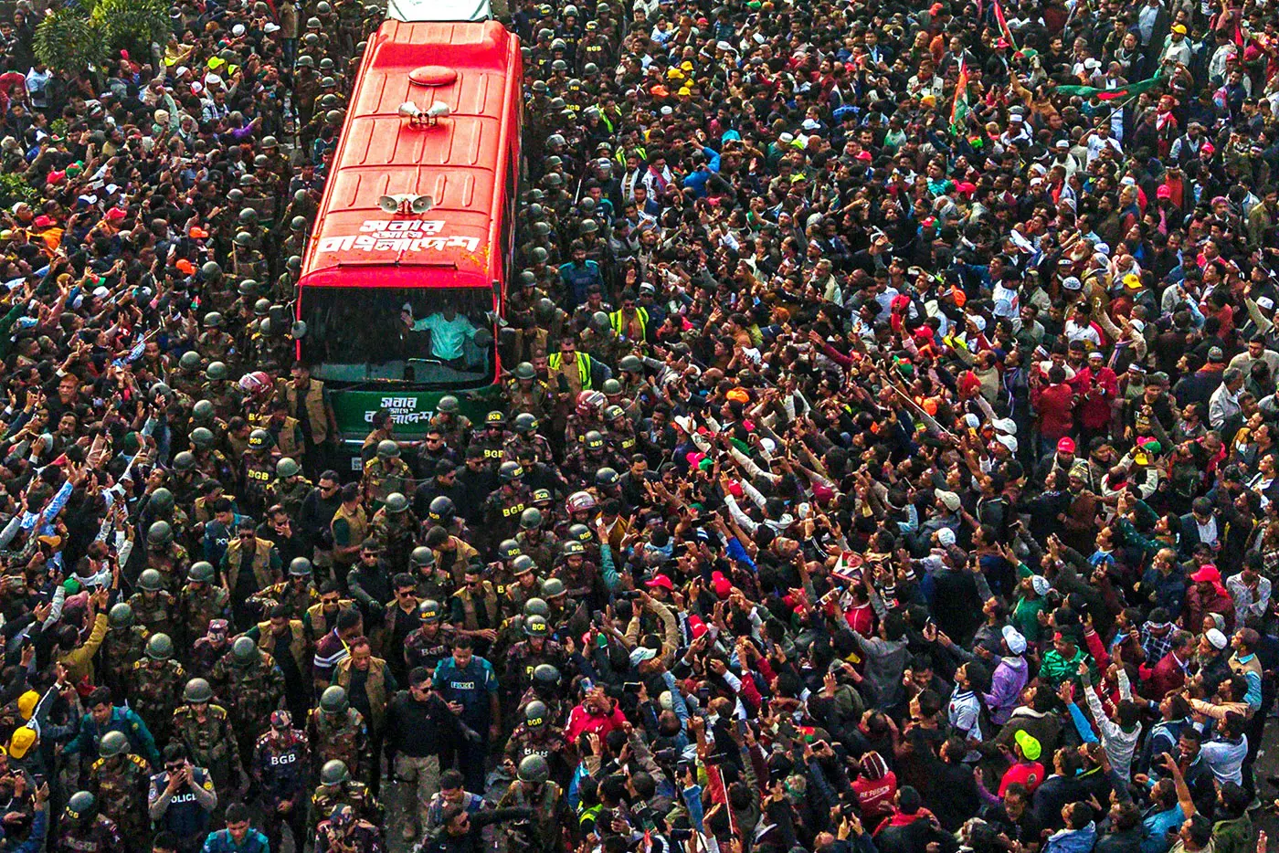 It’s been a whirlwind few weeks for Rahman, who arrived in Bangladesh on Dec. 25, greeted by hundreds of thousands of rapturous supporters who had waited throughout the night at Dhaka’s airport. Just five days later, his mother, Bangladesh’s first female Prime Minister Khaleda Zia, passed away following a long illness, drawing even larger numbers to throng the sprawling capital to pay their respects. “It’s very heavy in my heart,” says Rahman, eyes welling. “But the lesson I learned from her is that when you have a responsibility, you must perform it.”