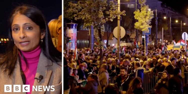 The BBC’s Rajini Vaidyanathan broadcasts from outside Hungary’s parliament as crowds hear about the prime minister’s concession.
