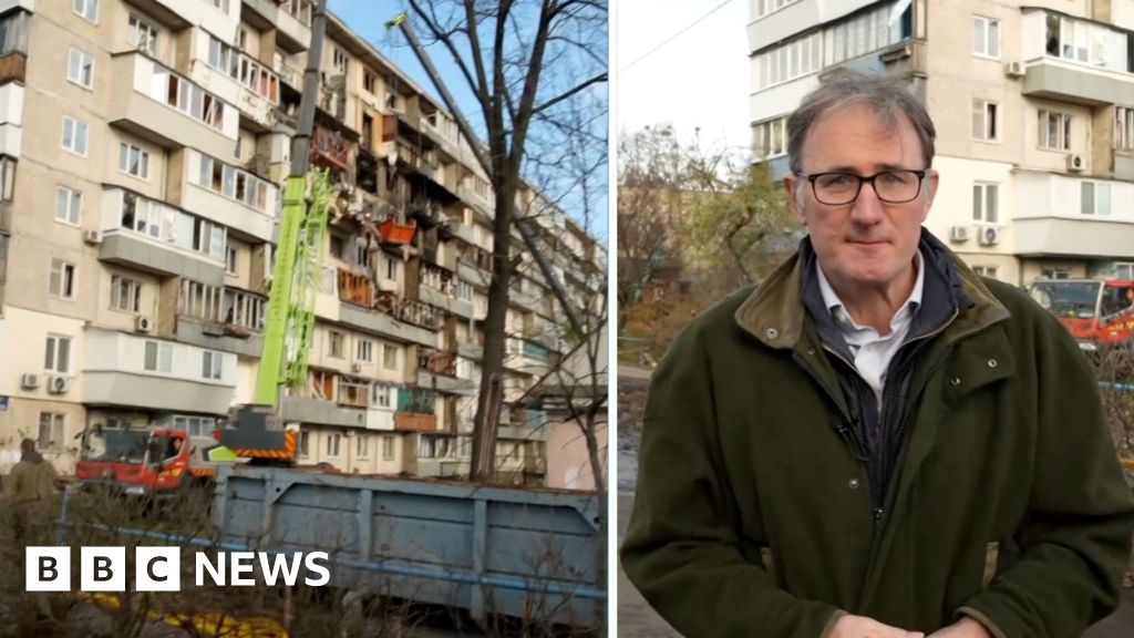 The BBC’s James Landale visited the scene of one attack in eastern Kyiv where a drone rammed through a block of flats and left six people dead.