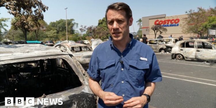 The BBC’s Will Grant visits Puerto Vallarta, a popular coastal resort town in Jalisco state, to see the lines of burnt cars in a Costco car park and the cleanup.