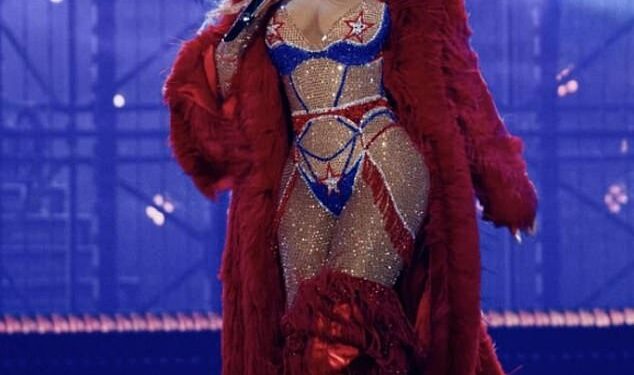 On July 4 she painted the stage red, white and blue and strutted around in a fur coat with the imagery of the American flag