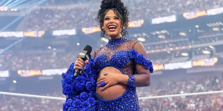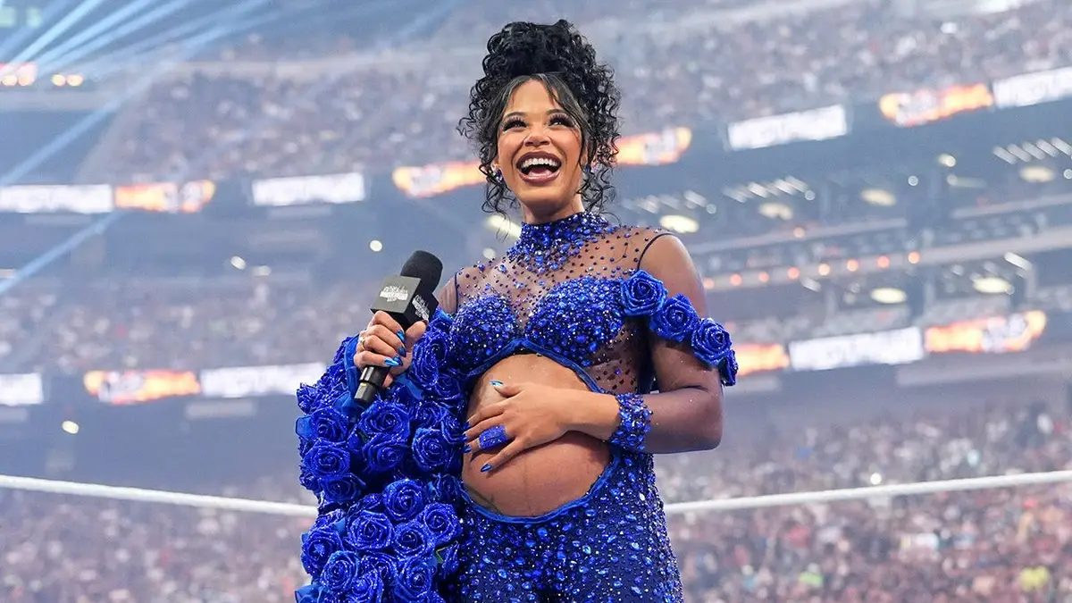Bianca Belair announces her pregnancy during WrestleMania 42: Night 1 at Allegiant Stadium in Las Vegas, Nev., on April 18, 2026. (Rich Freeda/WWE)
