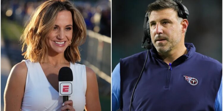 Dianna Russini, left, and Mike Vrabel, right, are shown in a split composite image featuring Russini with an ESPN microphone and Vrabel on the Titans sideline wearing a headset. (Imagn Images)
