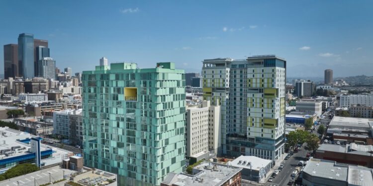 The housing is built on a 1.12-acre lot in downtown Los Angeles, replacing a parking lot, and it marks the largest 100% supportive housing development in L.A.