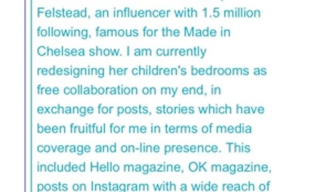 ‘I am currently redesigning her children’s bedrooms as free collaboration on my end, in exchange for posts, stories which have been fruitful for me in terms of media coverage and on-line presence…