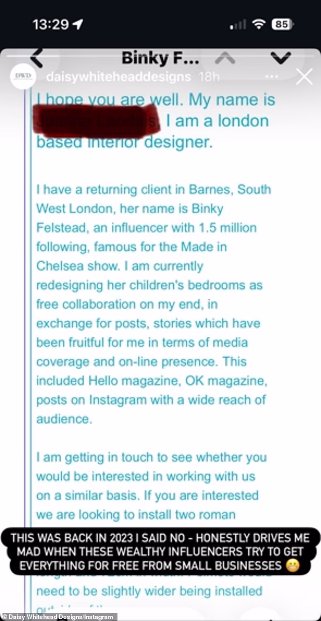 The original email from Binky’s interior designer read: ‘I hope you are well. My name is [redacted], I am a London based interior designer…