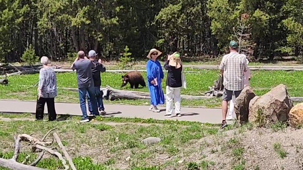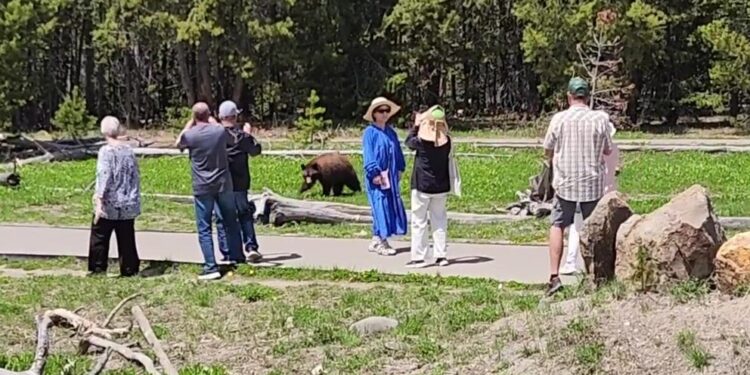 TOURISTS GET DANGEROUSLY CLOSE TO BEAR FOR PHOTO OP AT YELLOWSTONE NATIONAL PARK