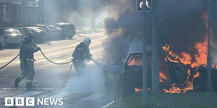 Firefighters trying to put out a vehicle fire after a drone strike on Belgorod, Russia