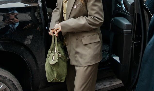 Wearing a khaki double-breasted suit, a tan vest over a pink button-up shirt, a green suede purse and a five-leaf clover pin for good luck, she walked in alongside her lawyers to face Baldoni for her first time since their legal battle began in December 2024.
