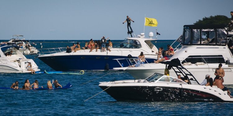 People gather on boats anchored on Lake Michigan in Chicago, Illinois, U.S., on Saturday, Sept. 5, 2020. (Taylor Glascock/Bloomberg via Getty Images)
