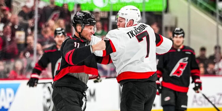Jordan Staal of the Carolina Hurricanes and Brady Tkachuk of the Ottawa Senators fight during the first period of Game 1 in the first round of the 2026 Stanley Cup Playoffs at Lenovo Center in Raleigh, N.C., April 18, 2026. (Josh Lavallee/NHLI/Getty Images)