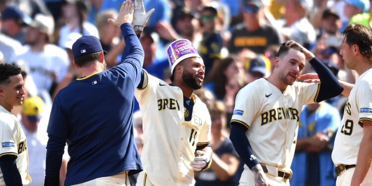 The Milwaukee Brewers celebrate a walk-off single by center fielder Jackson Chourio during the tenth inning against the Los Angeles Dodgers at American Family Field in Milwaukee July 9, 2025. (Patrick Gorski/Imagn Images)