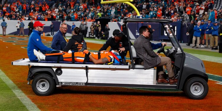 Pat Bryant of the Denver Broncos is carted off the field during the fourth quarter against the Jacksonville Jaguars at Empower Field At Mile High on Dec. 21, 2025 in Denver, Colorado. (Justin Edmonds/Getty Images)