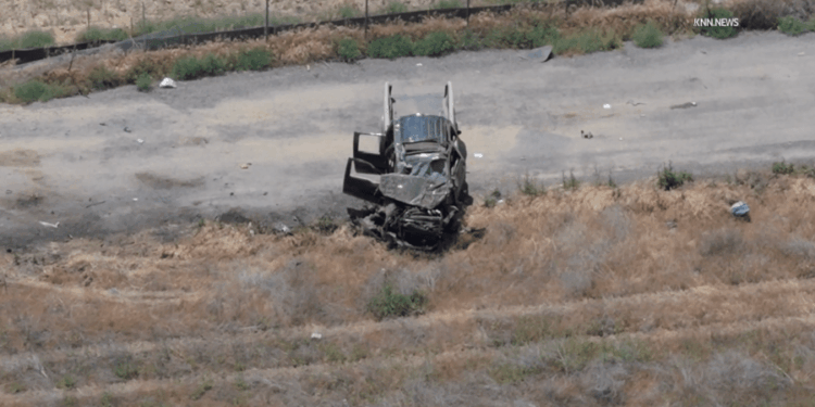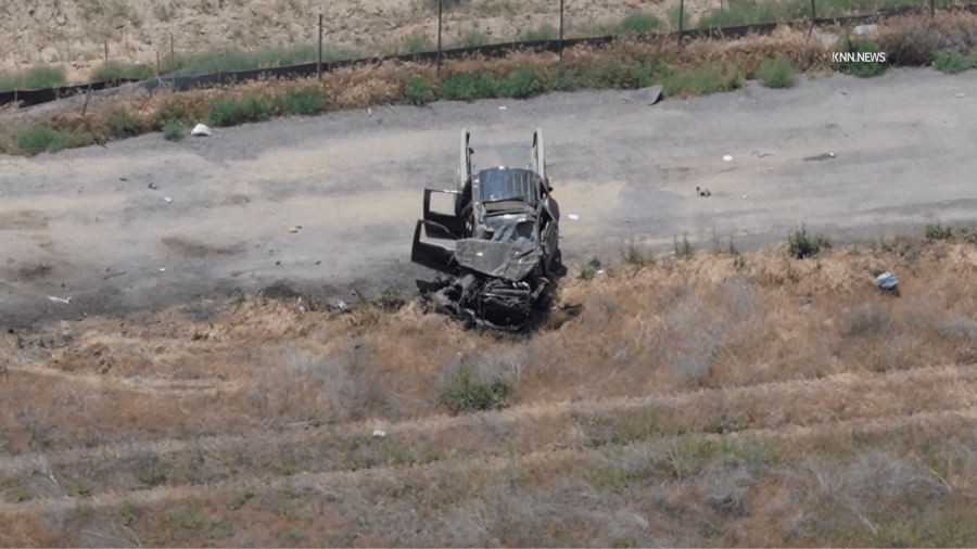 • A mangled pickup truck is seen after crashing and rolling off the 5 freeway in Castaic. May 2025. (KNN)