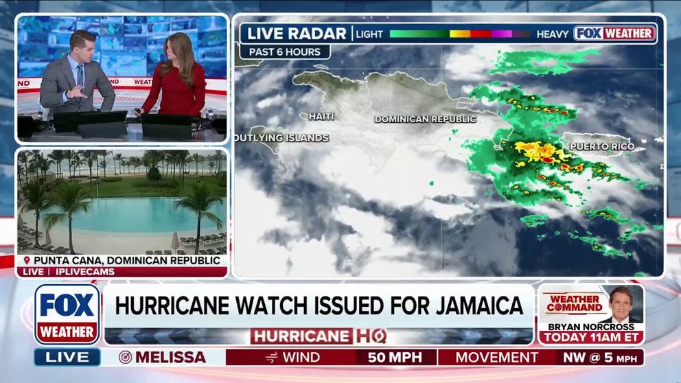 Jamaica issued a Hurricane Watch and Tropical Storm Warning Thursday morning. The island nation is expected to see hurricane conditions, including life-threatening flash flooding, from Tropical Storm Melissa beginning Friday afternoon. Melissa is still forecast to become a major Category 4 hurricane sometime late this weekend, or early next week, according to the National Hurricane Center.