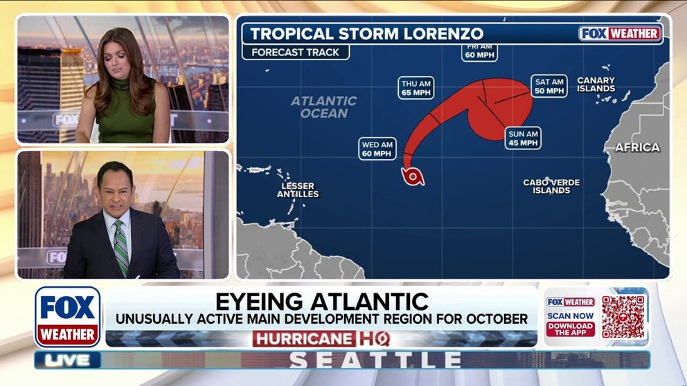 Tropical Storm Lorenzo is moving north from the central tropical Atlantic. It’s being impacted by hostile upper winds and is not expected to strengthen very much while it loops and dies over open water.