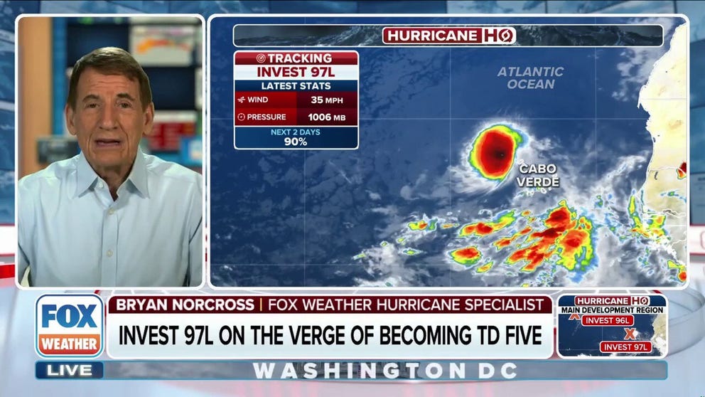 This satellite image shows Invest 97L in the tropical Atlantic basin.