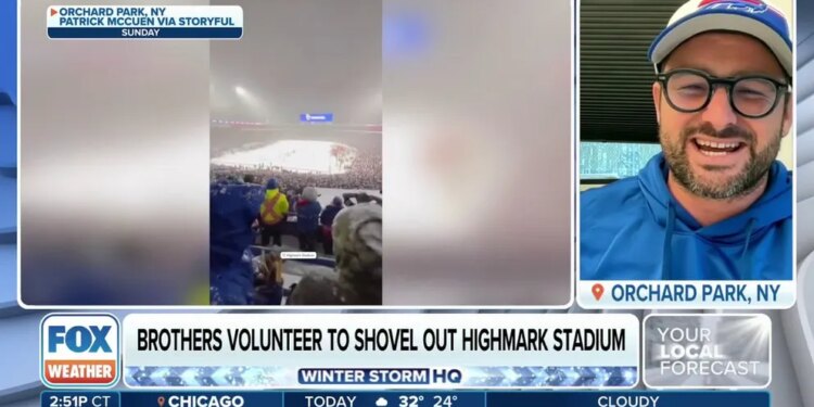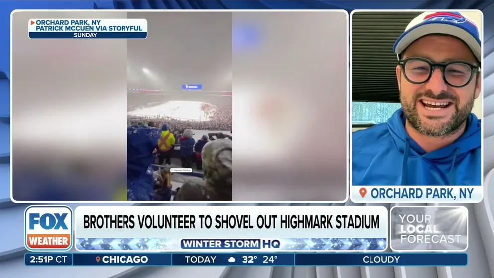Brothers Patrick and Colin McCuen, California residents and Buffalo Bills fans, volunteered to shovel out snow from Highmark Stadium on Sunday. Patrick spoke to FOX Weather about the experience. Dec. 3, 2024