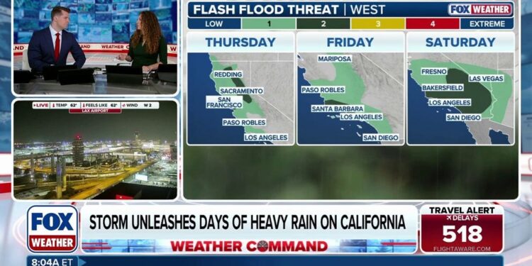 The storm system is forecast to bring several months’ worth of rain to Southern California in the span of just a few days, while a flash flood threat covers the Bay Area and Northern California Thursday.