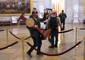 The man seen carrying a podium from former House Speaker Nancy Pelosi's office during the U.S. Capitol riot on Jan....