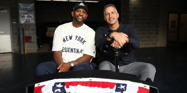 CC Sabathia and Andy Pettitte pose for a photo before honoring CC Sabathia’s Hall of Fame pregame ceremony prior to the game between the Toronto Blue Jays and the New York Yankees at Yankee Stadium on Sept. 7, 2025 in New York, New York. (New York Yankees/Getty Images)