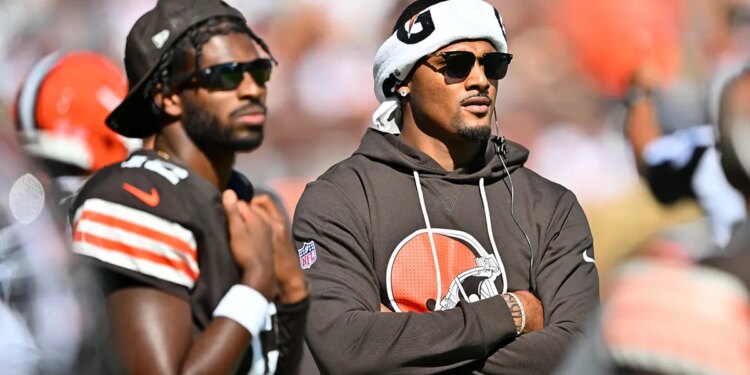 Quarterbacks Shedeur Sanders and Deshaun Watson of the Cleveland Browns watch from the sidelines during a game against the Cincinnati Bengals at Huntington Bank Field in Cleveland, Ohio, on Sept. 7, 2025. (Jason Miller/Getty Images)