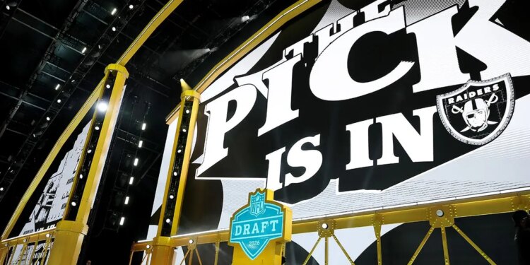 The Las Vegas Raiders’ first overall pick card is displayed during Round One of the 2026 NFL Draft at Acrisure Stadium in Pittsburgh, Pennsylvania, on April 23, 2026. (Emilee Chinn/Getty Images)