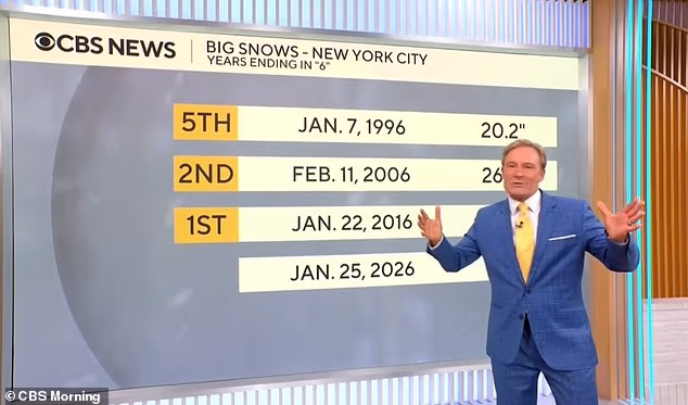 CBS weatherman Lonnie Quinn pointed out on air that some of New York City‘s biggest snowstorms have struck at roughly 10‑year intervals – often in years ending in the number six – suggesting the forecasted storm this weekend in January 2026 could fit the trend.