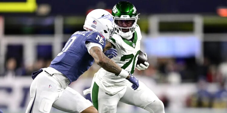 Armand Membou (70) of the New York Jets runs the ball during an NFL football game against the New England Patriots at Gillette Stadium in Foxborough, Massachusetts, on Nov. 13, 2025. (Jaiden Tripi/Getty Images)