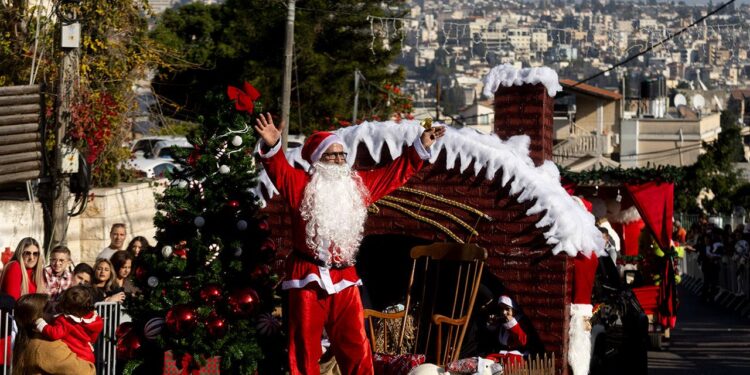 A man wearing a Santa Claus costume takes part in the 40th annual Christmas parade heading towards the Basilica of the Annunciation on December 24, 2025, in Nazareth, Israel. Nazareth, the home of Jesus, according to the New Testament, has seen a return of Christmastime tourism this year after two years in which celebrations were muted amid the war in Gaza. Nazareth, in Israel’s Galilee region, is a predominately Arab town, about one-third of whom are Christian, with the majority being Muslim. (Amir Levy/Getty Images)